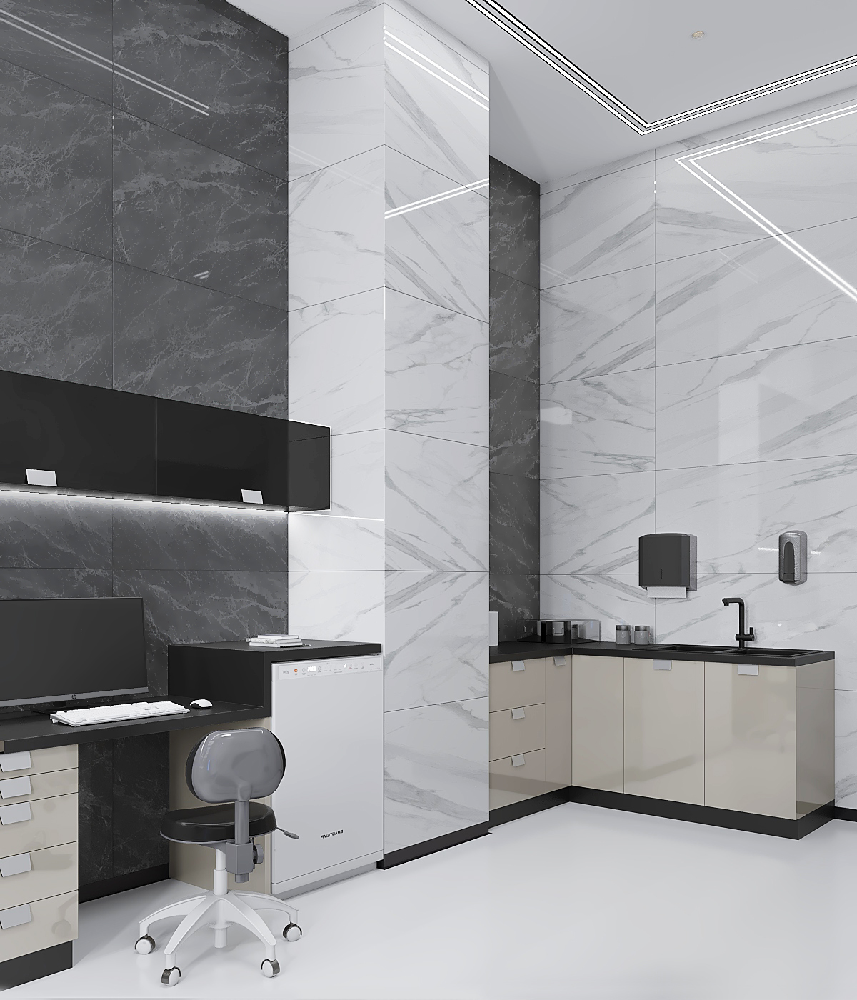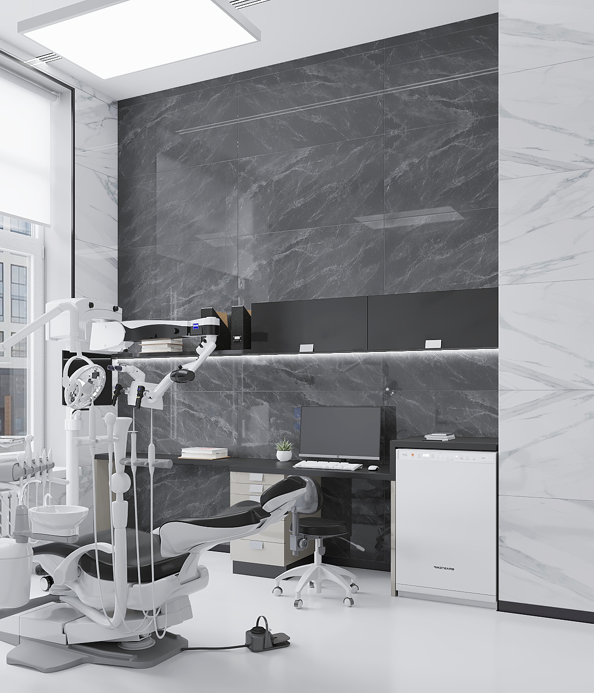 Создать уютную стоматологию, используя тёплую цветовую палитру – легко. А что, если разбить стереотипы и отдать предпочтение серым оттенкам и холодным тонам?